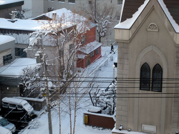 雪に埋もれた札幌について ホテルの部屋から外を見ますと 遙か向こうに札幌ドームの雪で真っ白な屋根が見え すぐ目の前がなんと教会