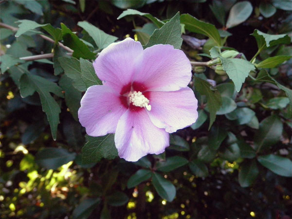 木槿(ムクゲ)はお隣の国の国花 この花は 早朝に咲き 夕方にはしぼむ花 しかしすごく丈夫な花で 枝を切って地面に挿すだけで根付くそうです
