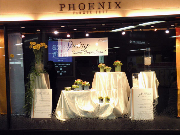 そのウインドウ 今日も 前を通りましたので 花たちは元気かなとみると なんと なんと 春を歌い上げる花たちに変わっていました